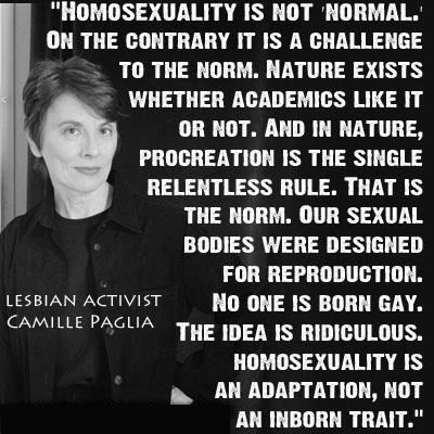Camille Paglia, who is a practicing lesbian, nevertheless rejects the deception and outright lies that the media, medical, and scientific communities have used to advance the spread of homosexuality. Coming from a self-professed lesbian pagan, her scathing exposure of the lies of homosexual advocates is an anomaly. In her book Vamps and Tramps, Paglia shares the following statements. (My comments will be in parentheses.)