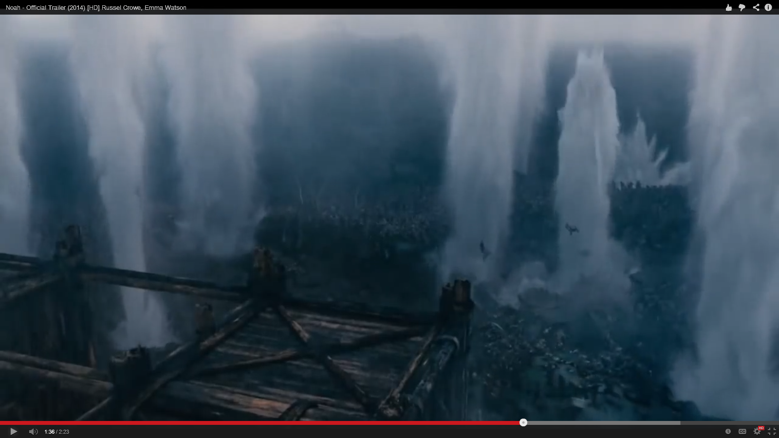 I watched the movie trailer, and of course the trailer shows just enough to make you think, maybe I should watch this. And watching the trailer you get a glimpse of truth in that the Bible describes the flood waters like this: In the six hundredth year of Noah’s life, in the second month, on the seventeenth day of the month, on that day all the fountains of the great deep burst forth, and the windows of the heavens were opened. And rain fell upon the earth forty days and forty nights. That’s about the only biblical reference that was a glimpse of truth as you can see from this screenshot of the official trailer.