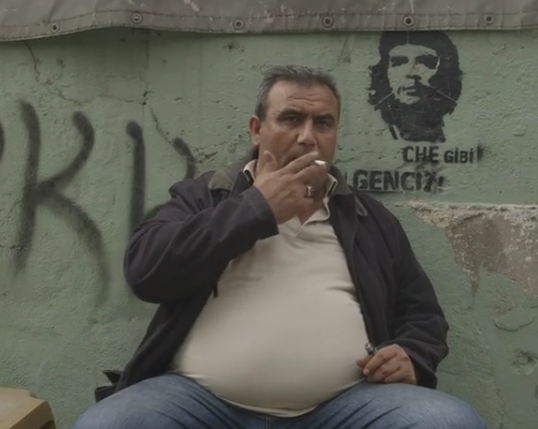 Screen shot a man sits in front of PKK grafiti: Note who the picture is next to this man: Che Guevera