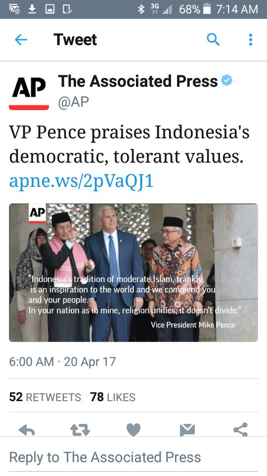 Now to what is most troublesome. Vice President Pence recently went to Indonesia and visited a mosque, bowed, took his shoes off and praised the leaders there for their “moderate muslim” government. Really?? And what’s most disturbing, is while UK Prime Minister Teresa May recently refused to donn a headscarf on her visit to Saudi Arabia, in solidarity with this symbol of oppression on women. Mike Pence’s wife and other females with, proudly donned a head covering in tribute.