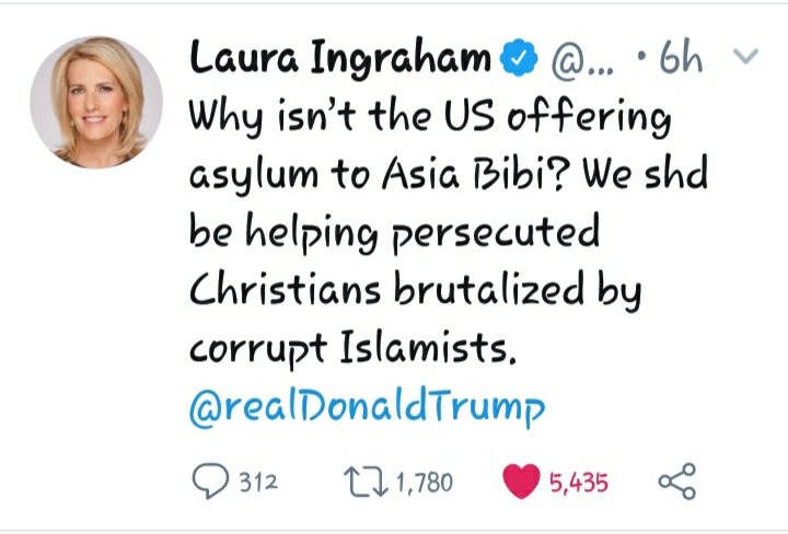 Thank you Laura Ingraham! Why arent those on the left screaming for this assylum seeker? Oh wait, shes Christian.