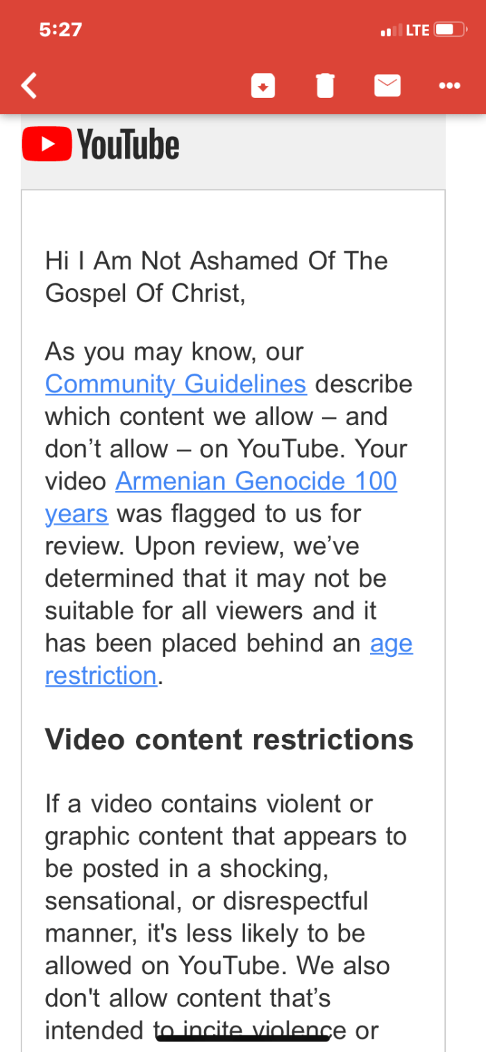 I awoke this morning to find a email from You Tube flagging a video I made a couple years ago on the Armenian Genocide on the 100 year anniversary. It doesn’t meet their standards. They say they’ve put an age restriction on it. Because it’s too gory. Here’s the email: