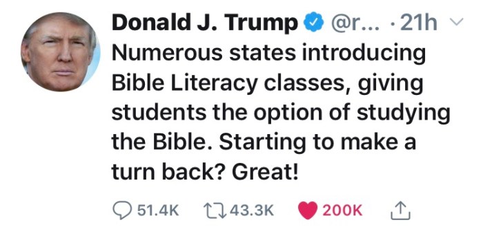 As President Trump encourages states to adopt legislation to allow biblical teachings in schools, the Democrats are making Government a god.
