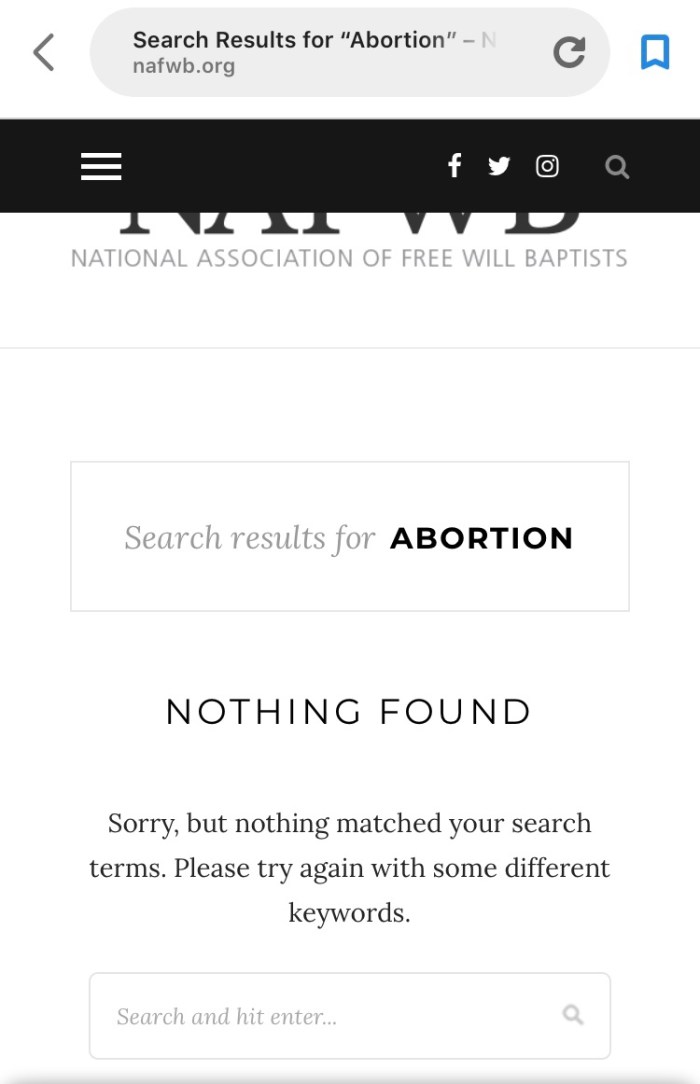 If your wondering why I titled my last post “I see dead people”, wonder no more. I decided this morning that I would give the church the benefit of the doubt. It’s been about a week since NY passed a law promoting infanticide and several days since VA declared you can Kill infants after birth. So I looked up the more prominent conferences in the US. First the Free Will Baptist Association, nothing, nada, zip, nothing on its sites about Abortion.
