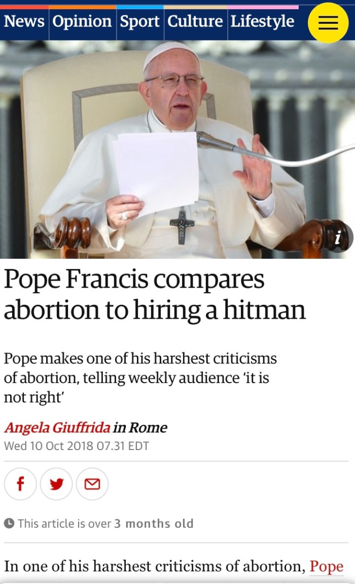 The Pope has not made a statement on fourth trimester abortions but did say in October last year that abortion was equal to hiring a hit man.