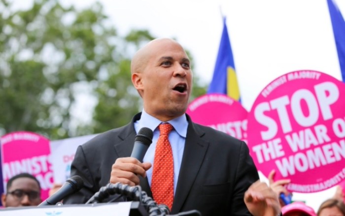 Cory Booker at a pro-Obamacare rally. In the background are supporters of Planned Parenthood. By Senate Democrats-wikimedia commons