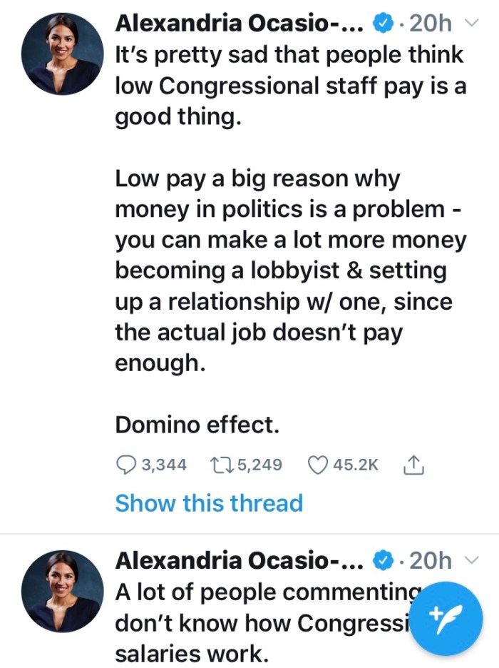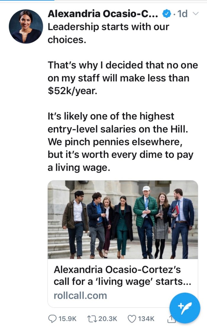 So the domino effect doesn’t apply to taxing business to death so they leave, but does apply to the 52,000$ a year she pays her staff? I just can’t believe her ignorance. Trouble is youth and others are swallowing her swill. She makes over 100,000 $ year. And who pays that? Who pays her staff that 52,000? We do. She’s great at doling out our money. How about she donate her entire salary like Trump? “The trouble with socialism is eventually you run out of other people’s money.”