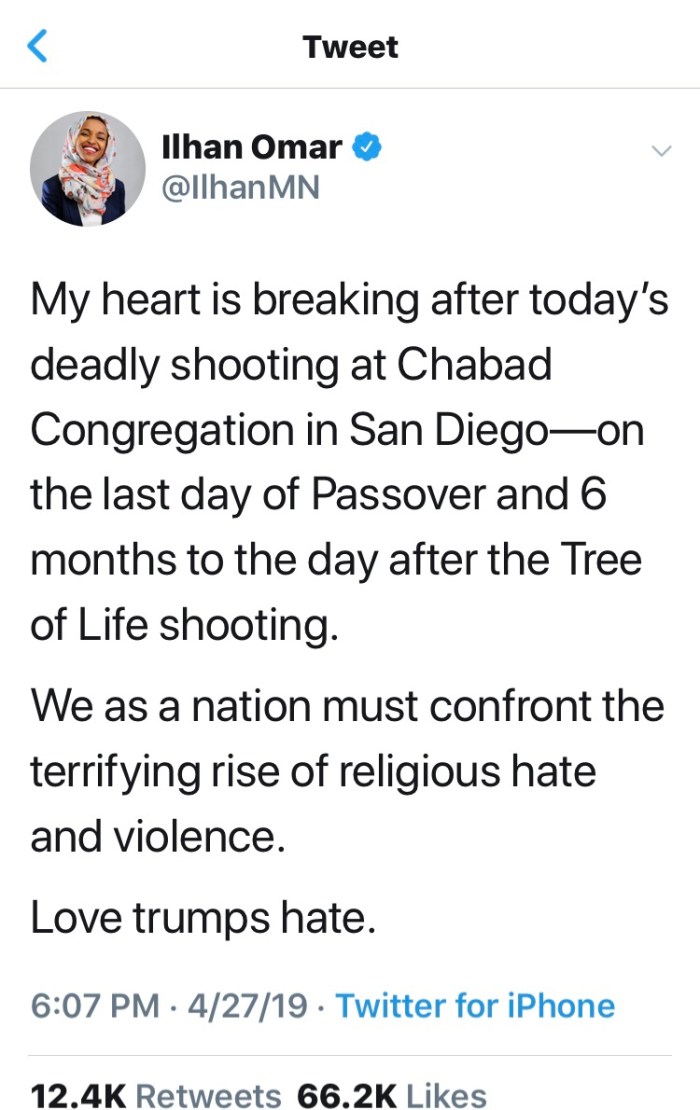 Look at this from Omar , her heart is breaking yet she uses the slogan from protestors spreading hate about Trump.