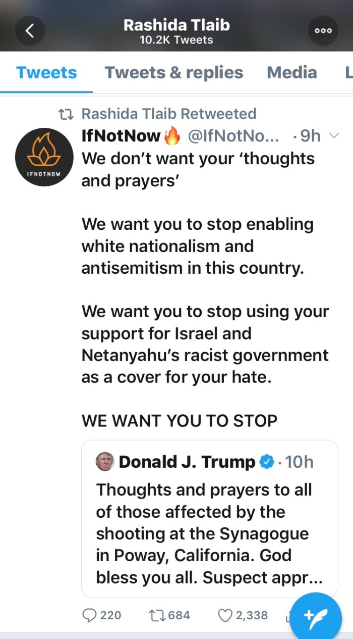 Look what Tlaib tweeted. Talk about spreading hatred, she is in competition with AOC and Omar for the top hater.
