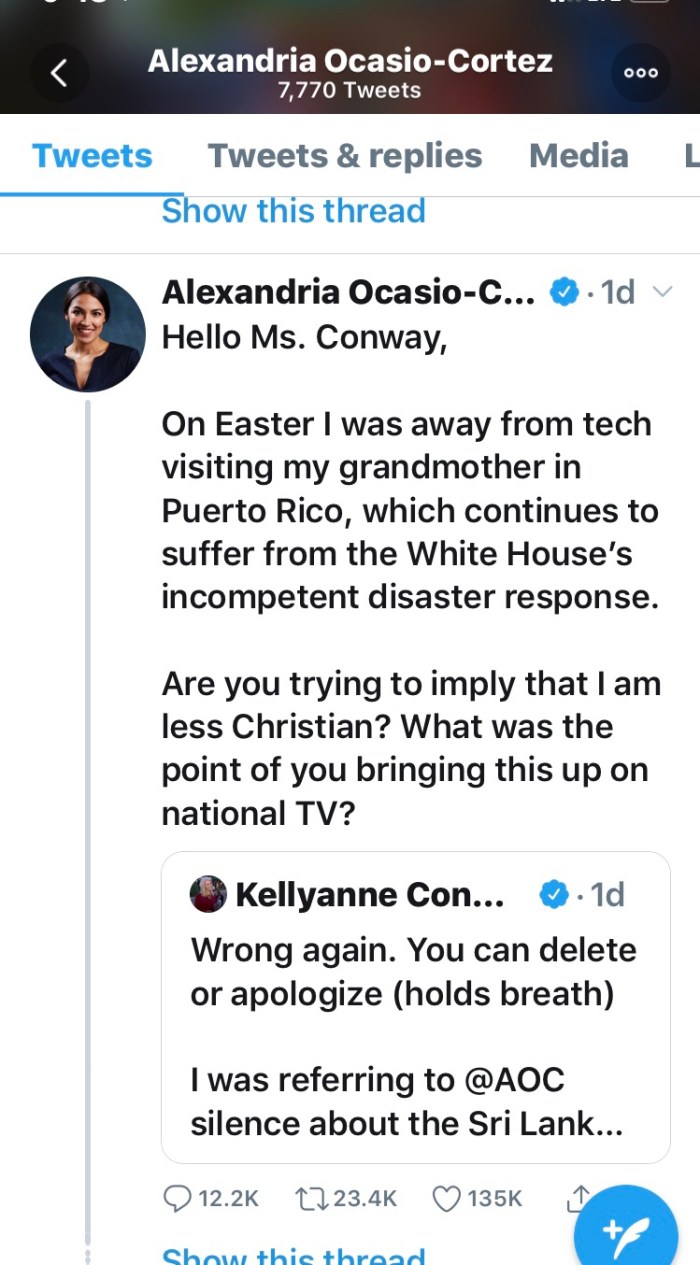 AOC attacked Kelly Ann Conway for simply asking why Cortez tweeted nothing, no support for the Christians slaughtered in Sri Lanka. Cortez gave the excuse she was in Puerto Rico without tech. But apparently she managed to tweet about a Netflix movie about herself. She accused Conway of stoking suspicion about her religion. No, it’s not about her religion or lack there of it’s about her disdain for Christians and Jews.