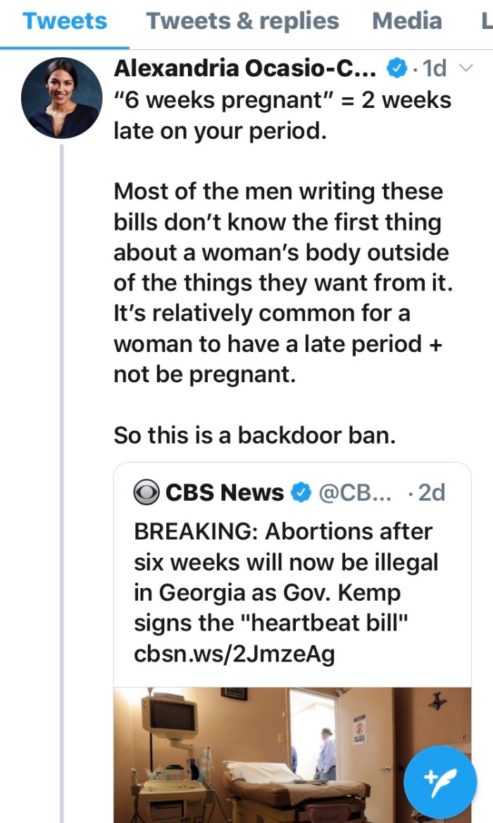 Corey Booker said recently that “abortion is healthcare”. But AOC tried to out do him. With Georgia’s new heartbeat bill, they have come out yet again. Cortez pointed out that a heartbeat is detected at only 6 weeks,that’s only a missed period for women by 2 weeks and she lamented that irregular menstrual cycles make it impossible to detect pregnancy that early.