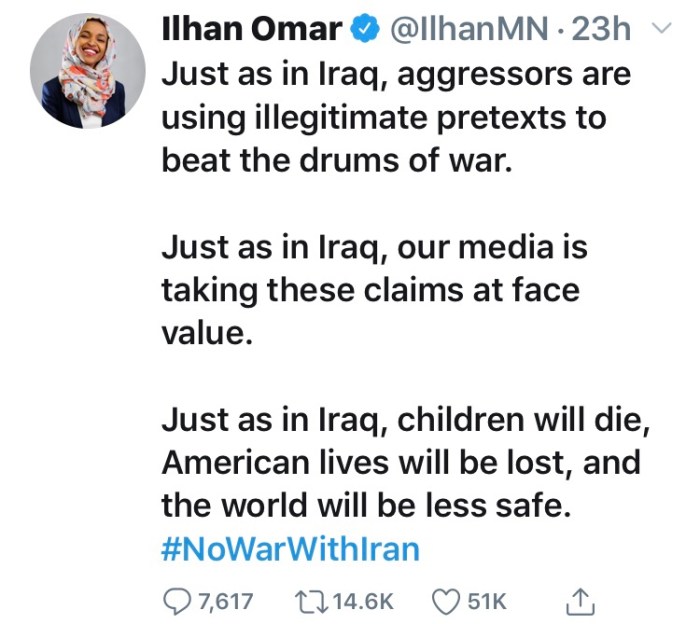 Ilhan Omar and her 2 cohorts continue to tout the praises of terroristic regimes like Iran. In Omar’s latest twitter rant she demeaned President Trump And our country attempting to shame us for even considering retaliation on Iran for the latest attack on our interests and allies.