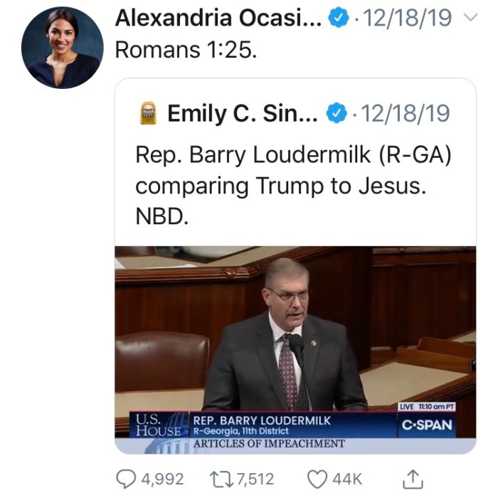 AOC tweeted an attack on Rep. Barry Loudermilk from Georgia that clearly shows her mocking disdain for God and His word. Representative Loudermilk, in his address to the House regarding the impeachment sham stated that even Jesus had a fair trial before Pilate. I can see His point as many of my friends and others have said the mob of degenerates in the House resemble the mob that helped to crucify our Lord. It is not a comparison of men but a clear view of the hatred present then and now.