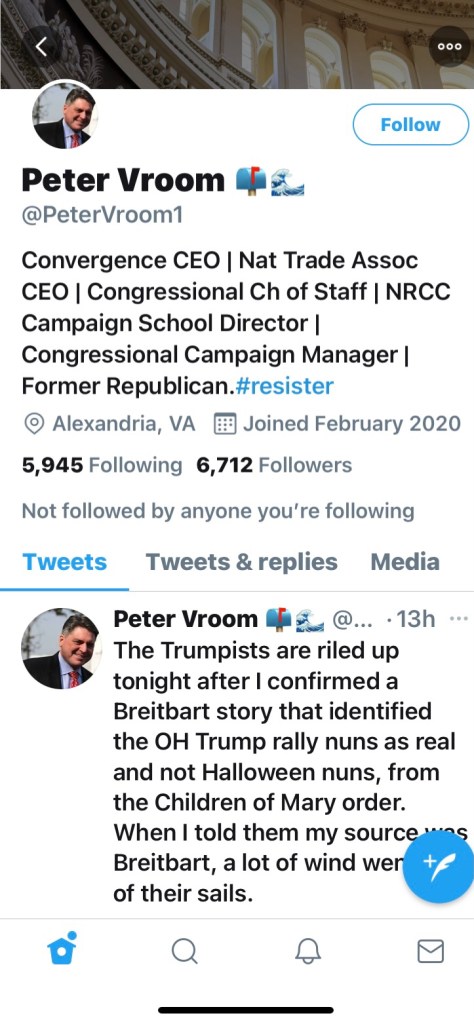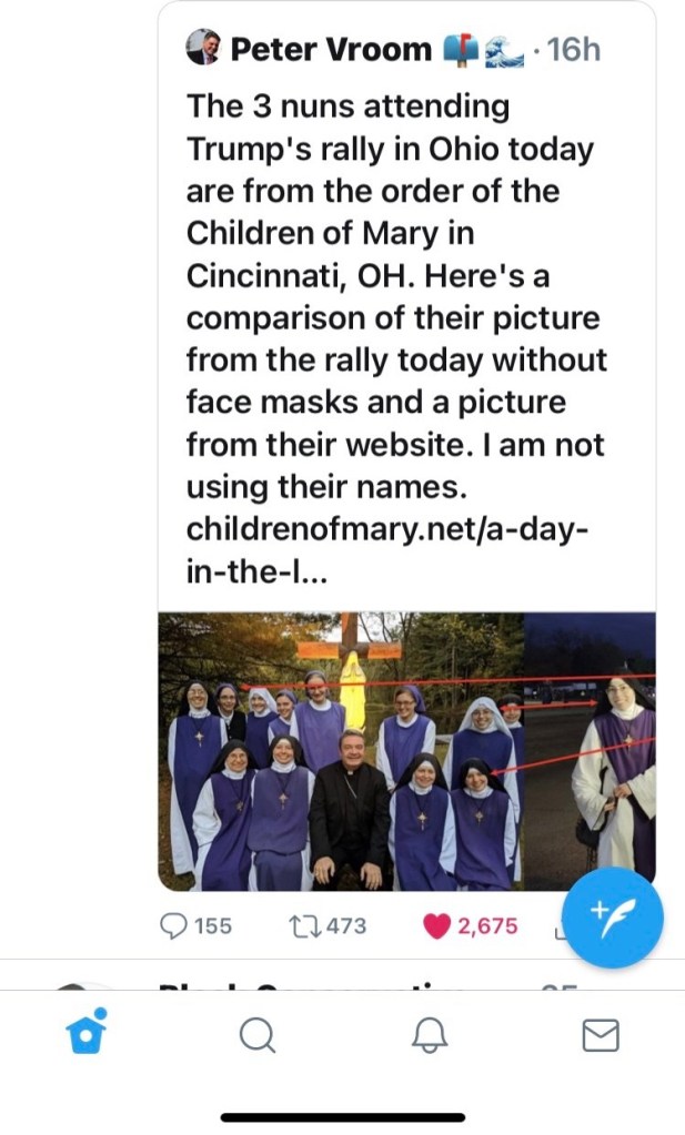 On twitter today a democrat who claimed to be a Congressional Chief of staff doxed 3 Nuns and posted their address. The left went crazy over these Sisters sitting behind President Trump at a rally. Why? Because these Nuns reminded them they stand for life not death or murder by abortion.