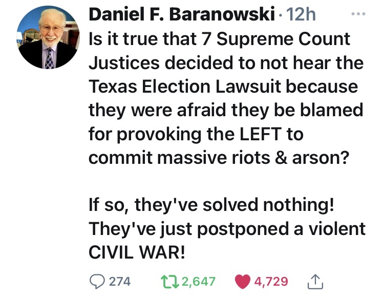 Couldn’t agree more. The SCOTUS lawsuit by Texas however was a joke, and Trump knew it. One state cannot tell another what to do. It DID draw attention though, which is good.