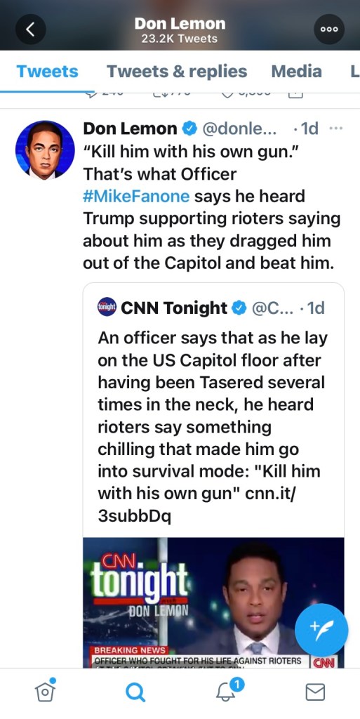 So much is happening it’s hard to concentrate on one thing. Since I last wrote even more evidence has come forward about the Antifa group who instigated the Capitol riot. You won’t hear it on the state run media. In fact CNN actually hosted the man in charge of the Antifa attack as an innocent witness. All while he was charged in Oregon for the same thing he did in DC and he was responsible there too for a MAGA man being killed. He is founder of an insurgent website and CNN covered it up. Don Lemon is calling Trump voters the KKK and nazis inciting violence against 74 million Americans but his twitter account is still open.