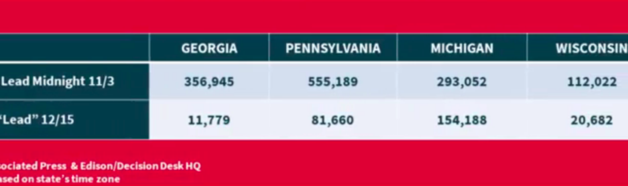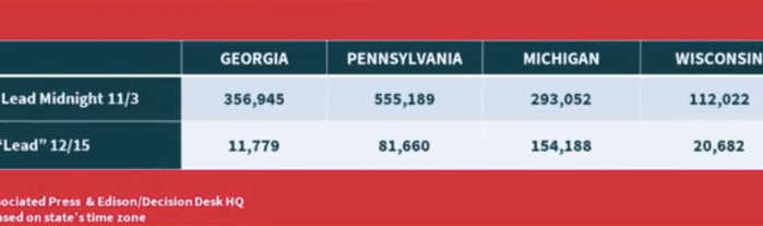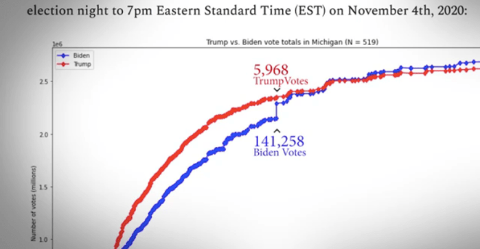 On election night Trump was ahead, significantly ahead. By 930pm on election night, it was already a statistical impossibility for Biden to win. Yet, all of a sudden, despite Trump’s substantial margin, Biden was ahead and winning the election, how did this happen? Notice in the graphic below Trump’s lead (top numbers) and then Biden’s fraudulent lead – which occurred within 5 hours, in the middle of the night. Note also that this sudden leap forward for Biden just by chance happened in not one state or even two, but FOUR states, and ALL at the same time. Oh, and they were all swing states, but that’s all just coincidence right?