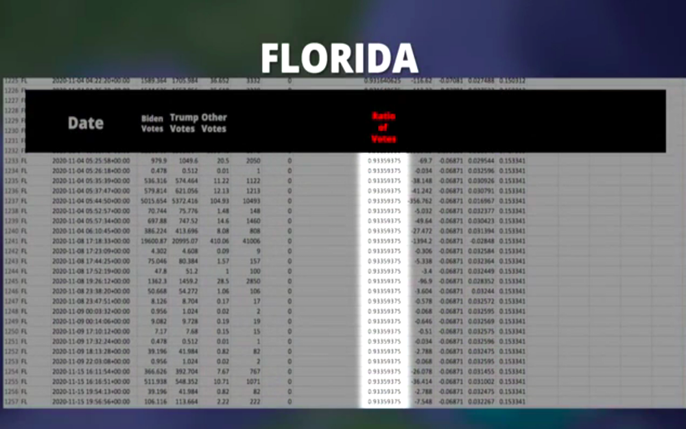 Over a period of days, more than a week actually, it was observed that the vote ratios between Trump and Biden in vote tabulation updates were identical – and this happened in more than one state. This is IMPOSSIBLE; there is no way that this could have naturally happened without any interference.