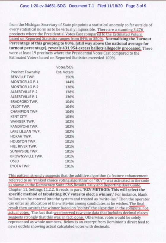 Russell Ramsland of Allied Security Group, LLC of Dallas, TX swore an affidavit concerning a detailed audit his company did on voting machines in Texas in 2018. He wrote in detail of the many serious security inadequacies of the software and then examined the 2020 Presidential vote count in a number of counties in Michigan. He reported that over 3,000 precincts in the state of Michigan reported a vote count between 80 and 350% of registered voters. He lists a number of precincts in his report and in some cases a massive over vote. The vast majority of the precincts on the list were on or about 100%. The whole affidavit makes for interesting reading.