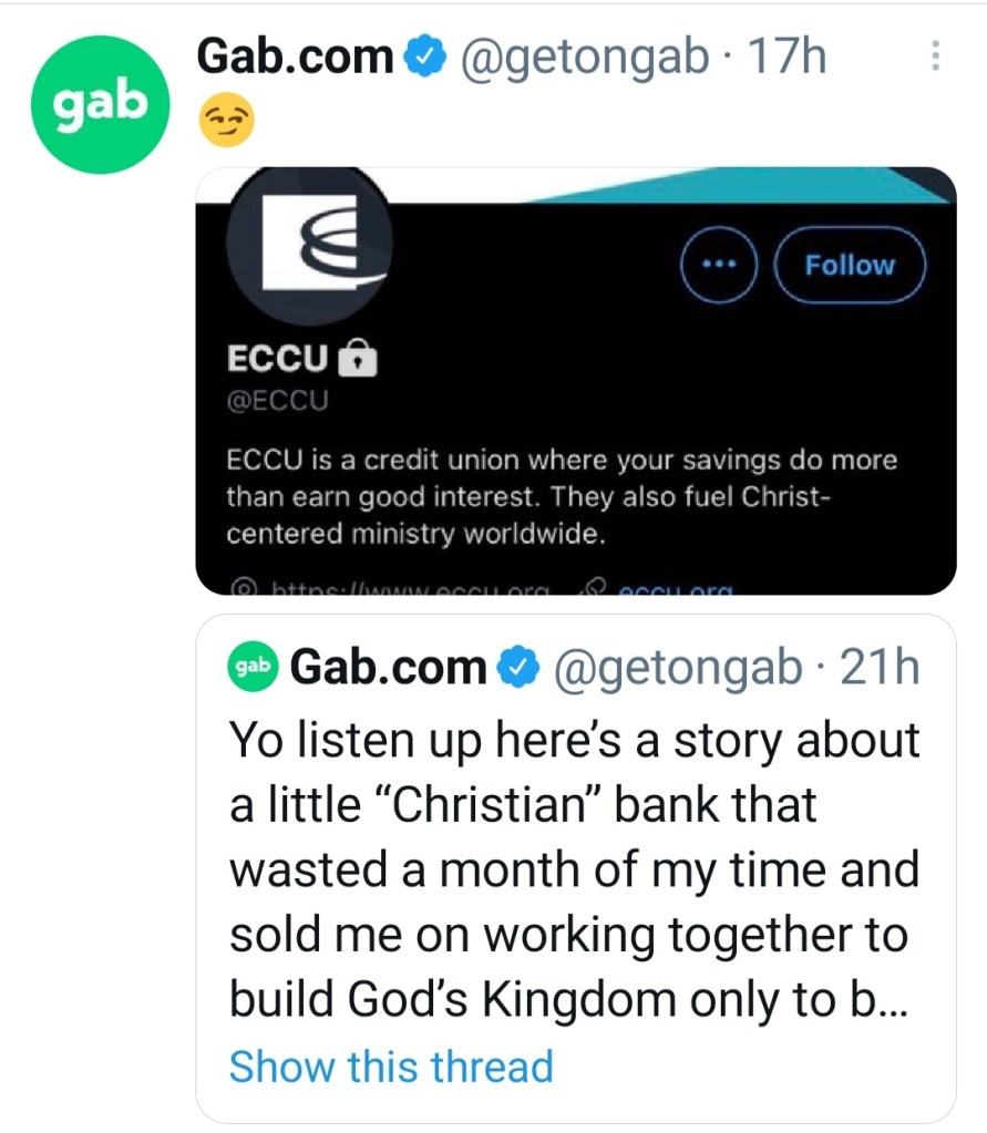Gab has had 4 banks dump them and they are not allowed to use their services. Even a bank owned by Christians dumped them.