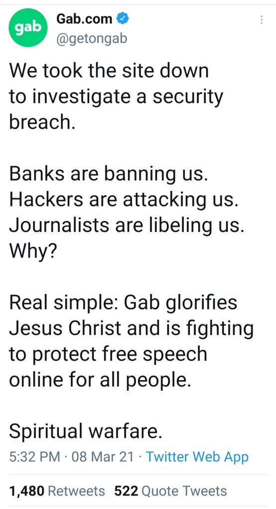 Conservative Christians are being attacked wherever they are. The conservative Christian owned social media site Gab was hacked and held for ransom. That’s a true story. I watched it happen. It’s a spiritual war and it’s raging.