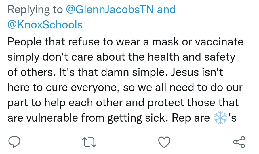 This comment (name removed) was placed on a Twitter post from Knox County mayor begging people to not put the children between this vicious fight over children being forced to wear a mask or opt out. Both he and the Governor of Tennessee said parents can decide if their child wears a mask. Two people challenged that and got a judge to mandate masks for children, this mayor’s opinion was attacked viciously even his personal appearance simply for wanting freedom to choose.