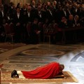 The grounded pontiff: Pope Francis pictured lying on the floor in prayer during Good Friday service in Saint Peter’s Basilica